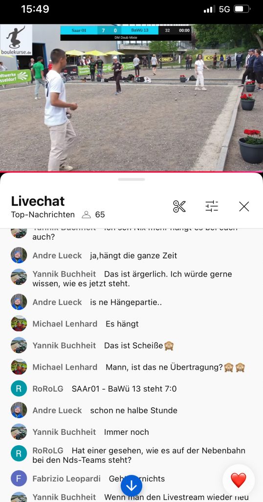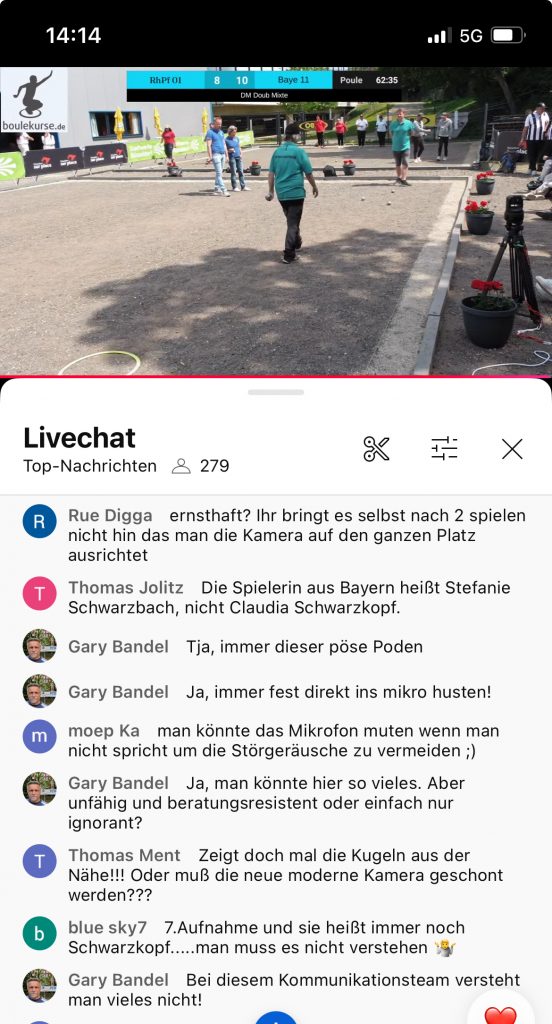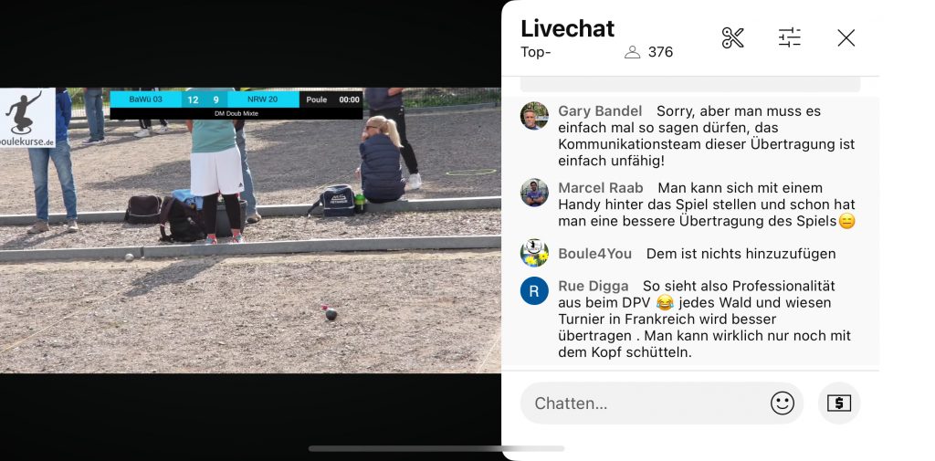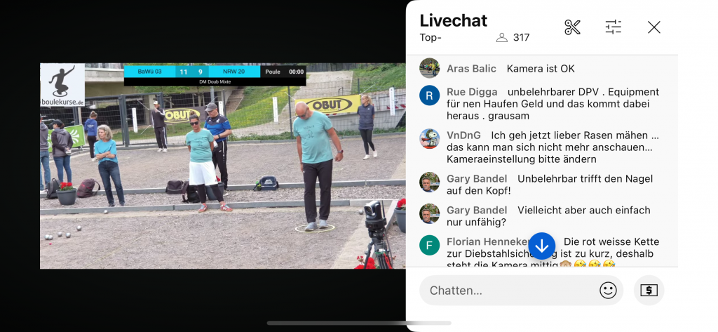 Wie berichtet, hätte boule4u gerne aus D’dorf übertragen. So „musste“ ich in Steinheim spielen und Dank der Erreichens des C-Finale blieben mir einige Streams am Samstag erspart. Einige Seher waren wenig begeistert. Warum es dem DPV Team nicht möglich ist, mit der neuen Technik (Starlink, neue Kameras und Software) von Beginn an stabil zu übertragen, ist nicht zu verstehen. Am Sonntag dann eine technisch astreine Übertragung. Bild und Ton, wie man es sich wünscht, die neue Replay Funktion kann man mögen oder nicht.