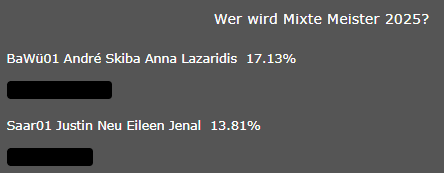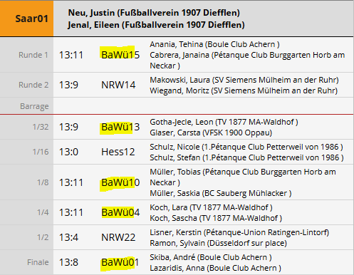 Gratulation auch an die Silbergewinner Anna und Andre, die sich im Halbfinale wie schon bei der LM gegen Matze Laukart und Domino Probst durchsetzen konnten. Die Achener spielten eine starke DM und waren im Finale nur um Nuancen schwächer. BaWü verlor den Titel an das Saarland, mit zwei Halbfinalisten und acht unter den letzten sechzehn bewies Bawü wieder die Vormachtstellung im Mixte Bereich. Im nächsten Jahr geht BaWü mit 37 (!) Startplätzen ins Rennen.