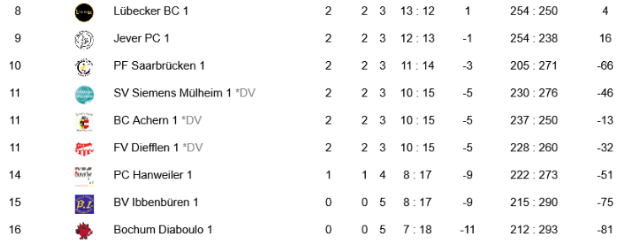 Alle Teams ab Platz acht brauchen PUNKTE. Allen voran Bochum und Ibbenbüren, die einen Horror Start in die Liga hatten. Und gleich zu Beginn geht es gegeneinander. Für Bochum folgt dann das Spiel gegen Hanweiler, möchte man in der Liga bleiben, sollte man mit zwei Siegen starten. Das gilt natürlich auch für Hanweiler (Start gegen Diefflen-Justin&Eileen) und Ibbenbüren (Spiel zwei gegen Saarbrücken). Der Aufsteiger Diefflen könnte sich mit Siegen gegen Hanweiler, Siemens, Saarbrücken, Ibbenbüren und Lübeck freischwimmen. Achern hat wieder einen knackigen Auftakt (Viernheim), gegen Jever muss gewonnen werden, dann geht es gegen Mannheim und dann die Berliner. Siemens hat zu Beginn Düsseldorf, dann die drei Saarländer, am Ende geht es gegen Bochum.