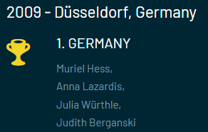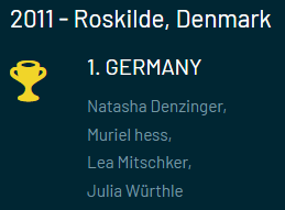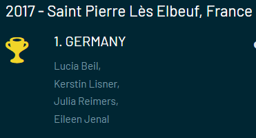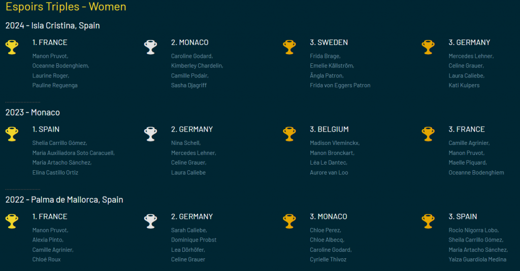 Bei den Espoir Frauen war es der vierte Titel. Die bisherigen drei Erfolge (Quelle CEP): https://www.cep-petanque.com/medals.html