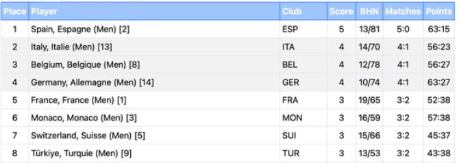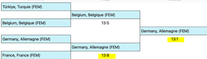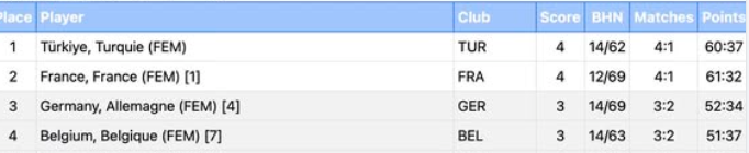 Nach einer guten Vorrunde erreichten Silvan Lichte, Mercedes Strokosch, Celine Grauer und Ella Koch mit 3:2 Siegen das Halbfinale. Aufgrund von nur neun Starten, wurde kein Viertelfinale gespielt. Es ging mal wieder gegen Frankreich. Wie unsere Herren bei der EM wurde offensiv gespielt, unsere vier Frauen hatten das Spiel gegen nicht souverän wirkende Französinnen von Begin an im Griff. Bei 9:3 und Kugelvorteil konnte man die Partie schon beenden. Ella hatte Schuß für Schluss, am Ende erzielte Frankreich den Punkt und kam etwas besser ins Spiel. Sollte es nochmal eng werden? Nein. Silvana spielte sich in einen Flow und liess es krachen. In der letzten Aufnahme holte sich Ella ihren Schuß für Schluss zurück und beendete die Partie mit einem Carreau für Vier.