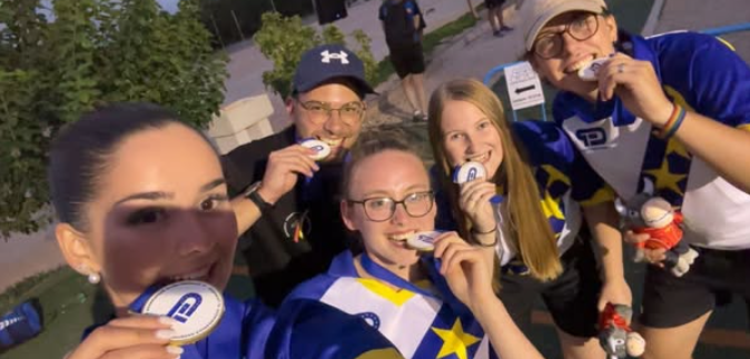 Die beiden Reporter an der Linie erinnerten schon an den deutlichen Sieg in der Vorrunde gegen den Finalgegner Belgien. Und so kam es. Nach 0:1 spielten Ella, Silvana und Celine groß auf und holten mit einem souveränen 13:1 Gold. Danach gab es großen Jubel, Live übertragen vom DPV Radio. Grandios!