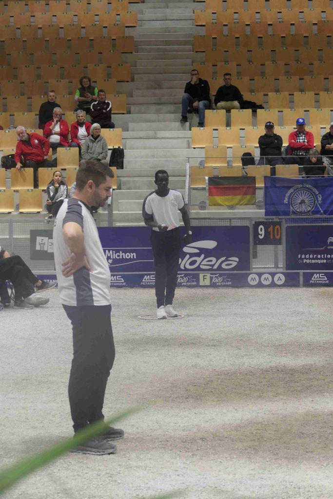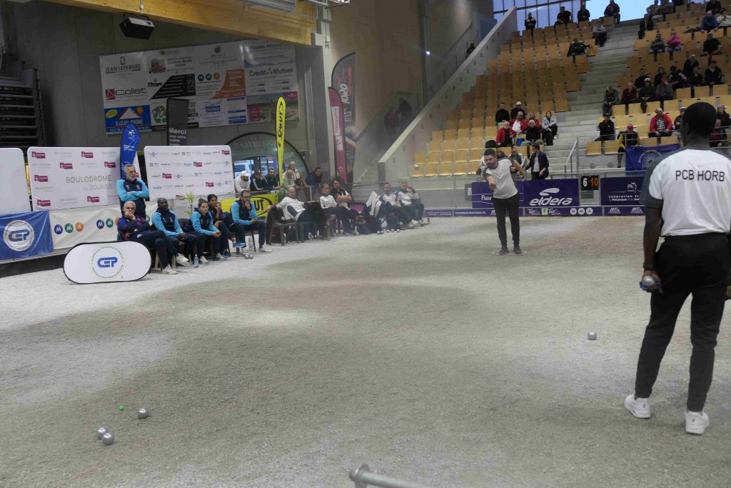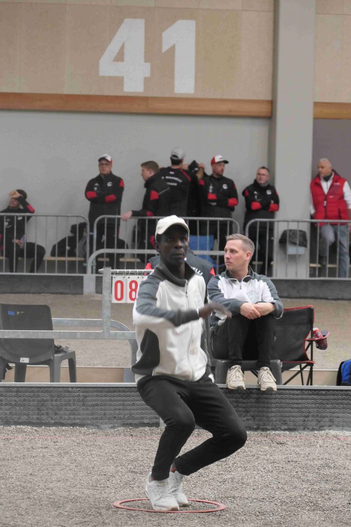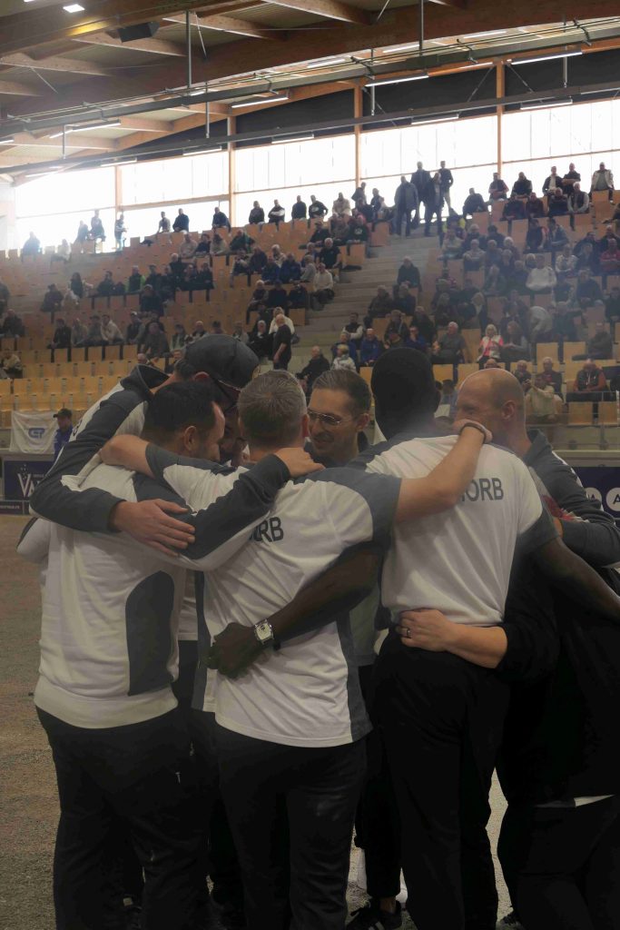 Nun musste noch ein Triplette gewonnen werden. Das Mixte mit den beiden Europameistern Tobse und Matze an der Seite von Janania kam nicht gut ins Spiel und verlor mit 4:13. Ängstliche Blicke auf den Nebenplatz. Dort hatten Kevin, Frank und Abdoulaye vermeintlich alles im Griff. Eine beruhigende 10:5 Führung. Dann kassierten die Horber einen Vierer und es entwickelte sich der erste Krimi des Wochenendes.