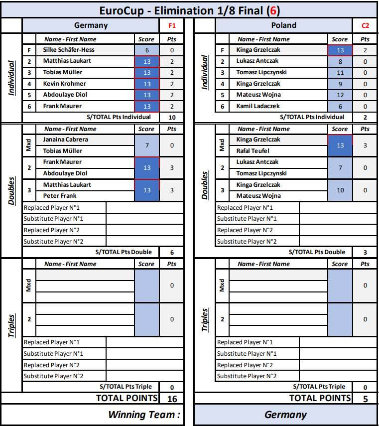 Im letzten Jahr ging es im Achtelfinale gegen Frejus. Die Franzosen erwiesen sich als eine Nummer zu groß für Horb. Diesmal hieß der Gegner Arlanc und wieder war Horb der Außenseiter. Es begann mit zwei Niederlagen von Silke und Matze. Das erste Ausrufezeichen setzte Tobse, der sein Tete zu 11 gewinnen konnte. Live im französischem Fernsehen spielte Kevin gegen den 14-fachen Weltmeister Phillipe Suchaud und schaffte die Sensation. Mit 13:11 verkürzte er auf 4:6 für Horb. Den Schlusspunkt setzte Aboulaye, der den „Altmeister“ und die Legende Christian Fazzino mit 13:4 beherrschte und ausgleichen konnte.