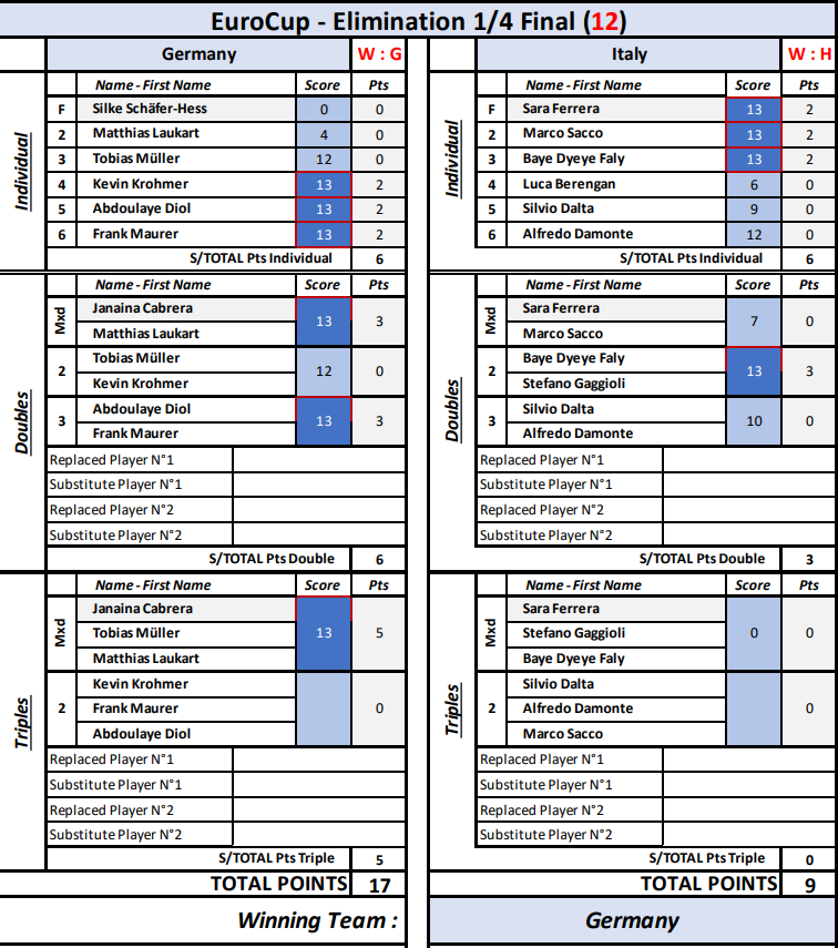 Mit 23:8 war es der klarste Sieg der Vorrunde. Gegen 20 Uhr war der lange Tag beendet. Zur Stärkung ging es zum „Stamm-Italiener“ mit der gesamten Horber Familie. Dort wurden die anderen Gruppenergebnisse geprüft und die nächsten Gegner analysiert. Im Achtelfinale Polen („machbar“) und dann Italien („Schwer“). Einige Verwunderung kam auf, als der Turnierbaum von der CEP versendet wurde und dort Spanien statt Italien der potentielle Gegner im Viertelfinale sein sollte.