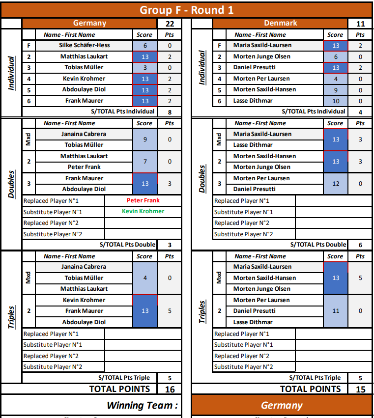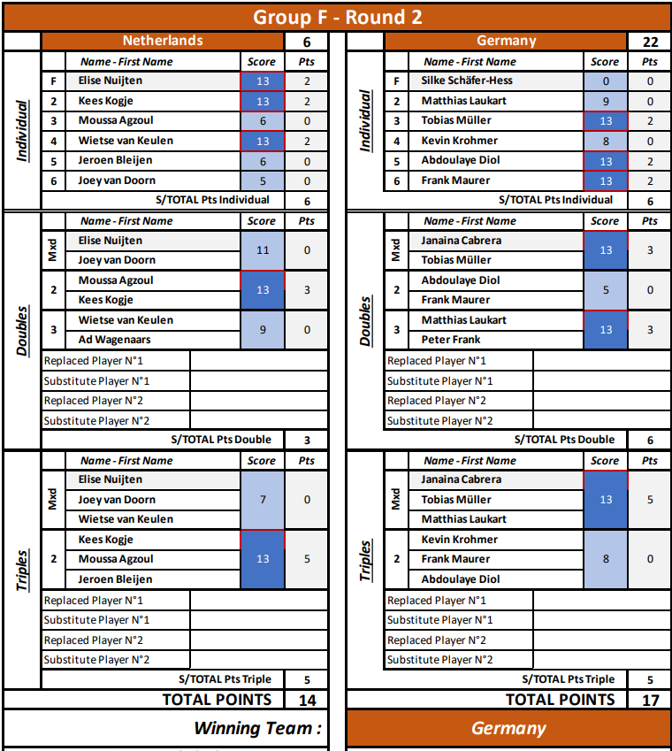 Zwei Doubletten waren der Plan, um in Führung zu gehen. Das Mixte mit Tobse und Jana lieferte sich ein enges Match und holte den ersten Sieg. Der überragende Kees Koogje führte sein Team zum Ausgleich. Nun kam es auf Matze und Pete an. Bei Vorsprung der Niederländer stand Kevin kurz vor der Einwechslung. Pete legte eine Schippe drauf und Matze und Pete konnten den wichtigen Sieg mit 13:9 einfahren.
