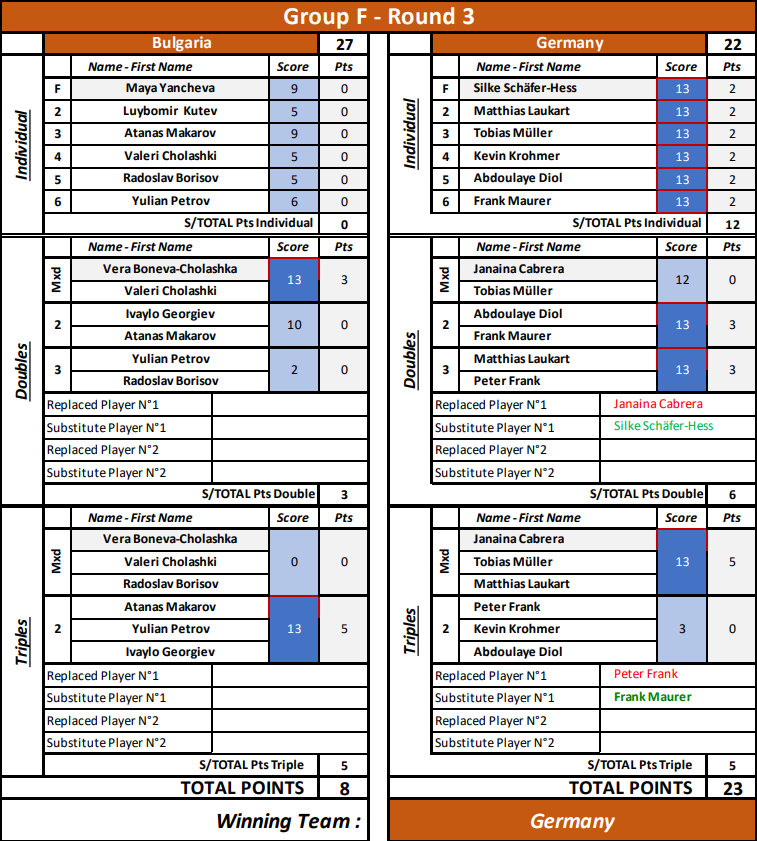 Damit war die Partie mit 18:3 eigentlich entschieden und auch die Gruppe entschieden. Da in der Vorrunde aber alle Spiele gespielt werden müssen, rafften sich alle noch zu den Tripletten auf. Die Horber erledigten die Pflichtaufgabe und die Bulgaren freuten sich über einen zweiten Sieg.